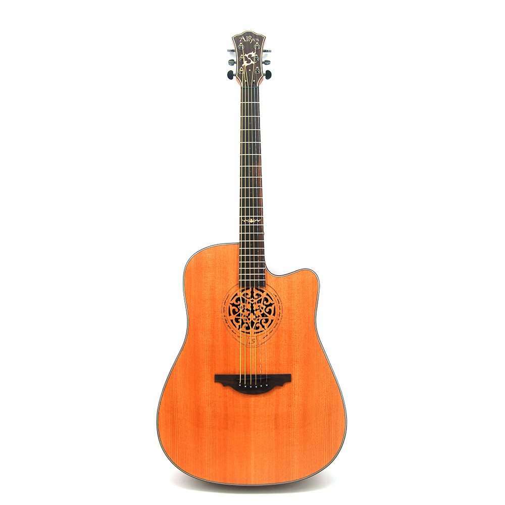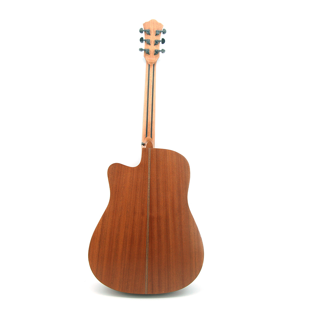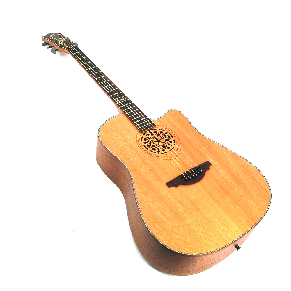 Popular Acoustic Guitar Body Type: Dreadnaught Shape: Cut-away Features:Model Number: S41U-001-Q Top: Cedar Back & Side: Sapele Fretboard /Bridge: Rosewood Neck: Mahogany Binding: Sapele Nut & Saddle: Plastic Steel Tuning machines: Chrome Diecast Rosette: Carving Frets: 21 Size: 41" Finish: Matt Color: Natural