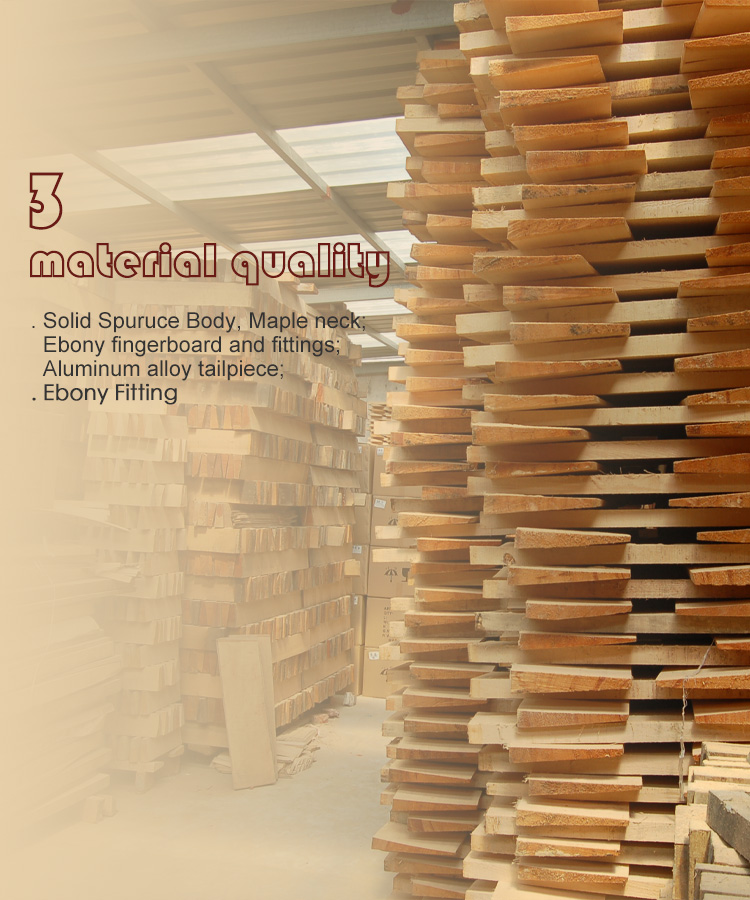 Mamy ścisły system kontroli jakości. Aby oferować klientom produkty wysokiej jakości, przywiązujemy dużą wagę do jakości, która wynika z profesjonalnej dbałości o szczegóły, począwszy od wyboru niedokończonych skrzypiec po procesy rzemieślnicze, malowanie i konfigurowanie. Wszystko to odbywa się na podstawa standardu wiolonczeli dla dorosłych i dzieci