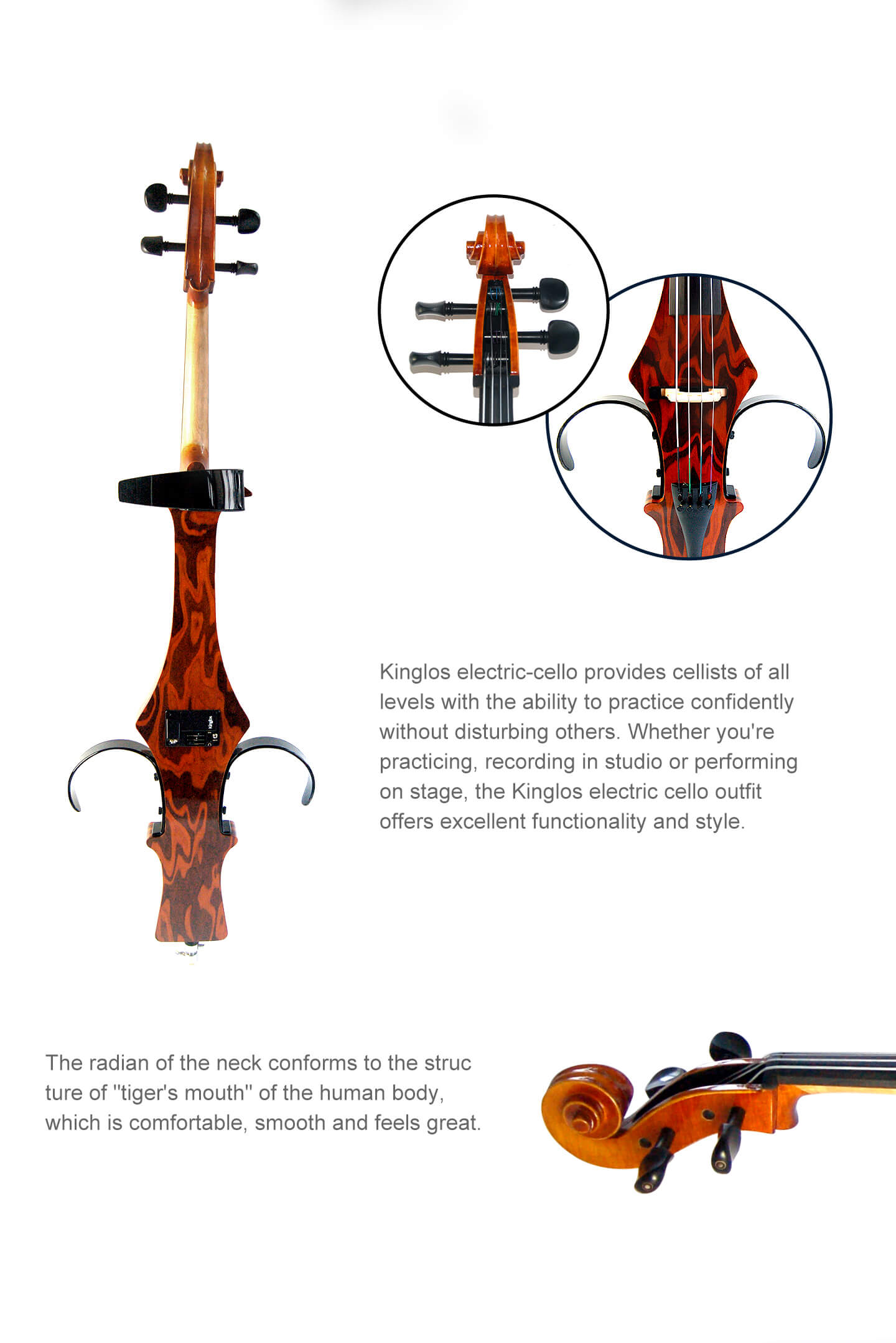 Chociaż wiolonczela elektryczna Kinglosa może wyglądać zupełnie inaczej niż tradycyjna wiolonczela, gdy zaczniesz grać, zauważysz różnicę! Elektronika w wiolonczeli otwiera zupełnie nowy świat możliwości. Z boku wiolonczeli można sterować dźwiękiem za pomocą regulatora głośności i pokrętła basowego. Wyjścia na wiolonczeli obejmują standardowe gniazdo wyjściowe 6,3 mm. Możesz nawet podłączyć odtwarzacz MP3 przez kolejne gniazdo 3,5 mm i odtwarzać ulubioną muzykę!