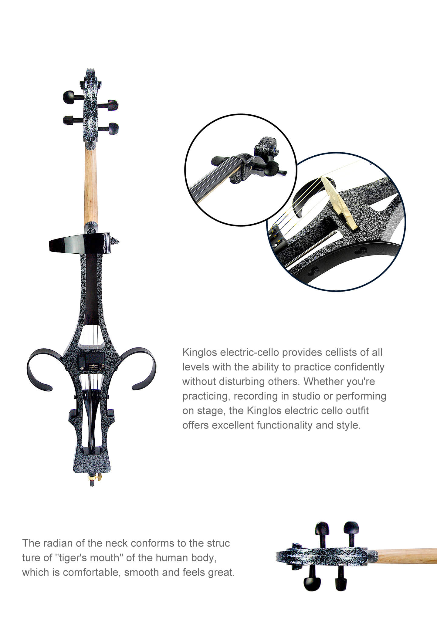 Chociaż wiolonczela elektryczna Kinglosa może wyglądać zupełnie inaczej niż tradycyjna wiolonczela, gdy zaczniesz grać, zauważysz różnicę! Elektronika w wiolonczeli otwiera zupełnie nowy świat możliwości. Z boku wiolonczeli można sterować dźwiękiem za pomocą regulatora głośności i pokrętła basowego. Wyjścia na wiolonczeli obejmują standardowe gniazdo wyjściowe 6,3 mm. Możesz nawet podłączyć odtwarzacz MP3 przez kolejne gniazdo 3,5 mm i odtwarzać ulubioną muzykę!
