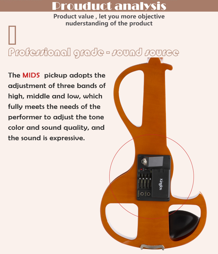 Te skrzypce elektryczne mają popularną konstrukcję, a przetwornik ma 3-pasmowy korektor EQ (wysoki, średni i niski), zaspokajający różne potrzeby wykonawcy