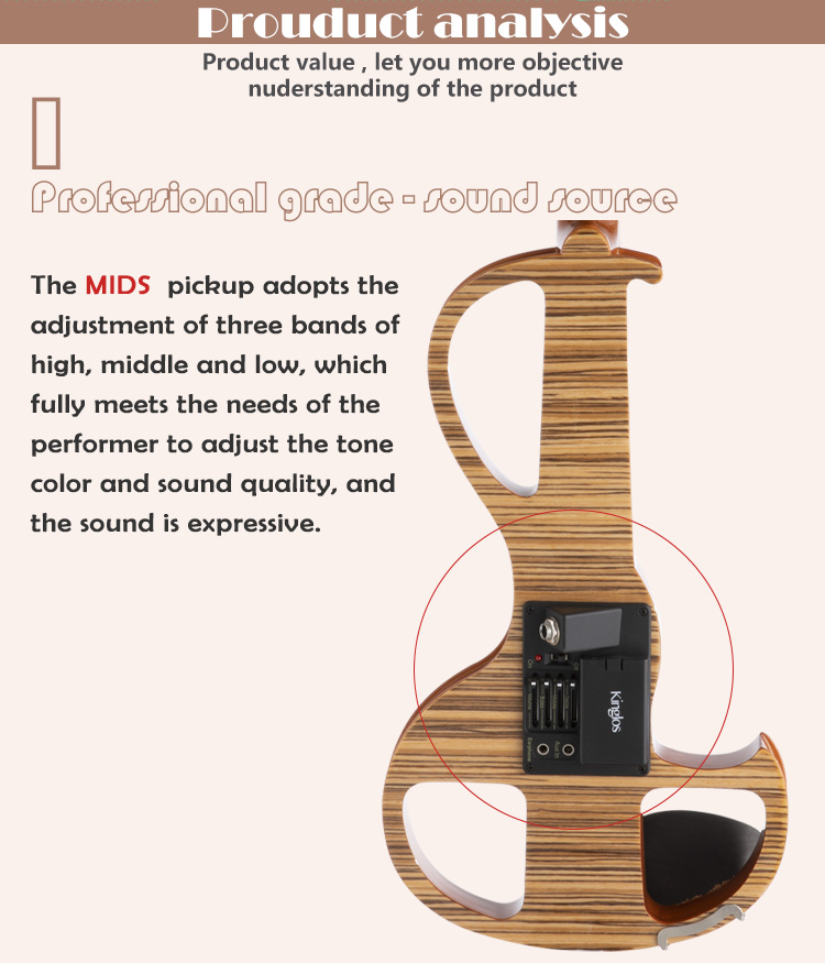 Te skrzypce elektryczne mają popularną konstrukcję, a przetwornik ma 3-pasmowy korektor EQ (wysoki, średni i niski), zaspokajający różne potrzeby wykonawcy