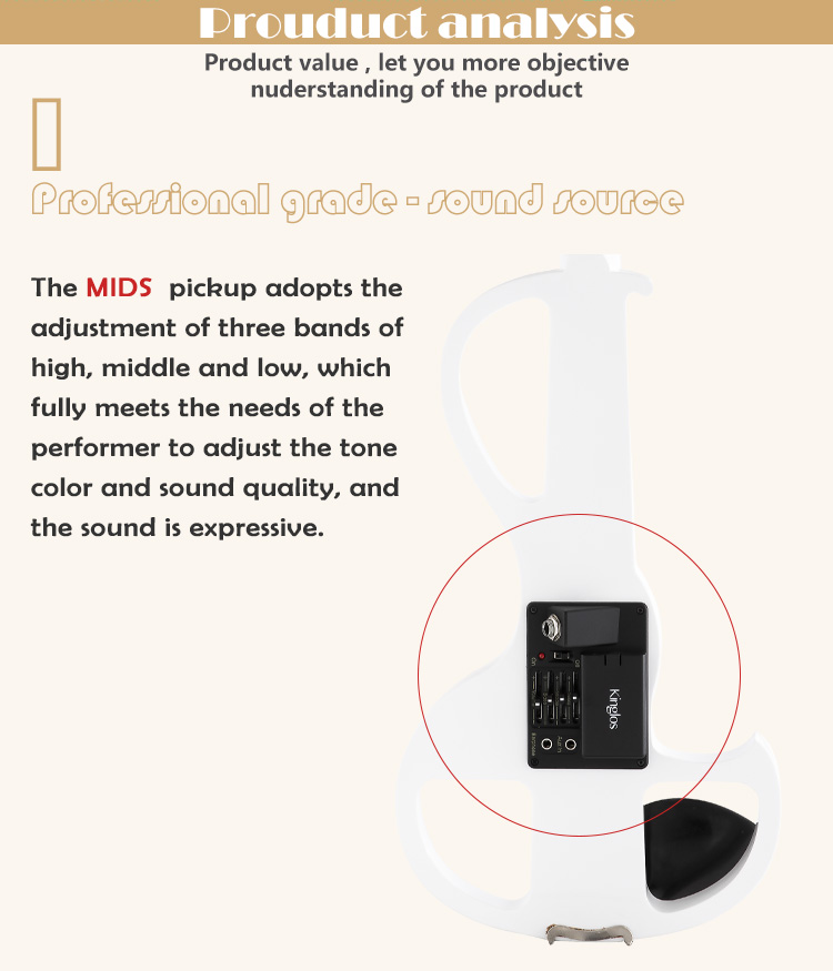 Te skrzypce elektryczne mają popularną konstrukcję, a przetwornik ma 3-pasmowy korektor EQ (wysoki, średni i niski), zaspokajający różne potrzeby wykonawcy