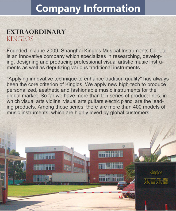 Opatentowana technika malowania gwarantująca zasady wibracji i wytwarzania dźwięku skrzypiec. Skrzypce Kinglos Visual Arts charakteryzują się piękną jakością brzmienia, zupełnie inną od skrzypiec wykończonych lakierem w sprayu w jednolitych kolorach czerwonym, żółtym, niebieskim, białym i czarnym itp. dostępnych na obecnym rynku.